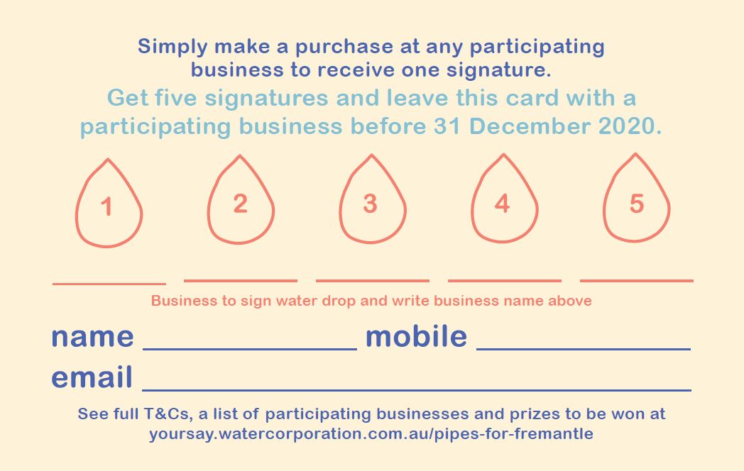 Customers simply need to obtain a signature and shop name on all five water drops, fill in their details on the loyalty card and leave it with a participating business. Participating businesses will be outlined on the Pipes for Fremantle webpage and participating businesses will be given posters to put in their shop window so customers can easily identify who is participating.